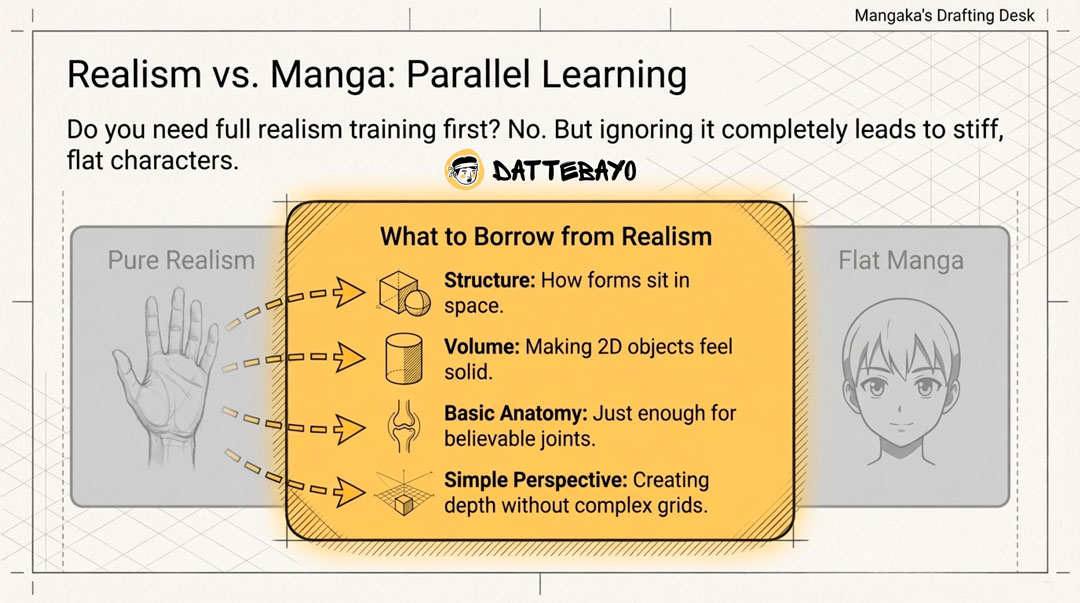You don’t need full realism training. But ignoring it completely often leads to stiff, flat drawings.