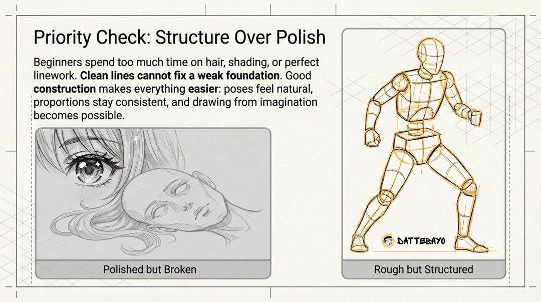 Beginners often spend too much time on hair, shading, or line polish. Those don’t fix weak structure.