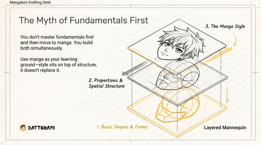 You don’t master fundamentals first and then move to manga—you build both at the same time.