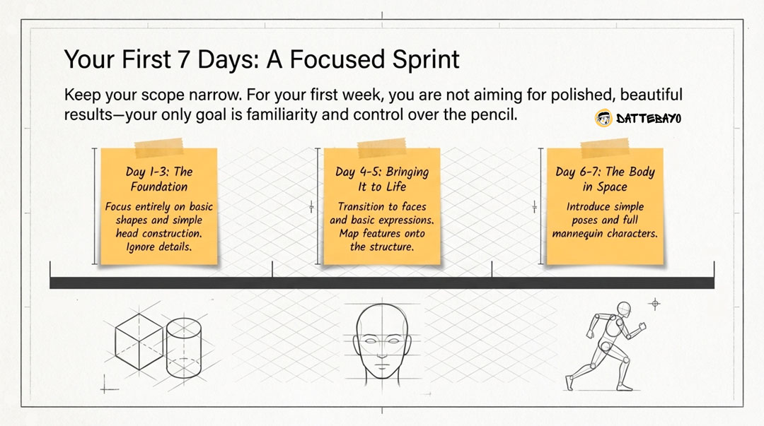 - Day 6–7: Simple poses and full characters