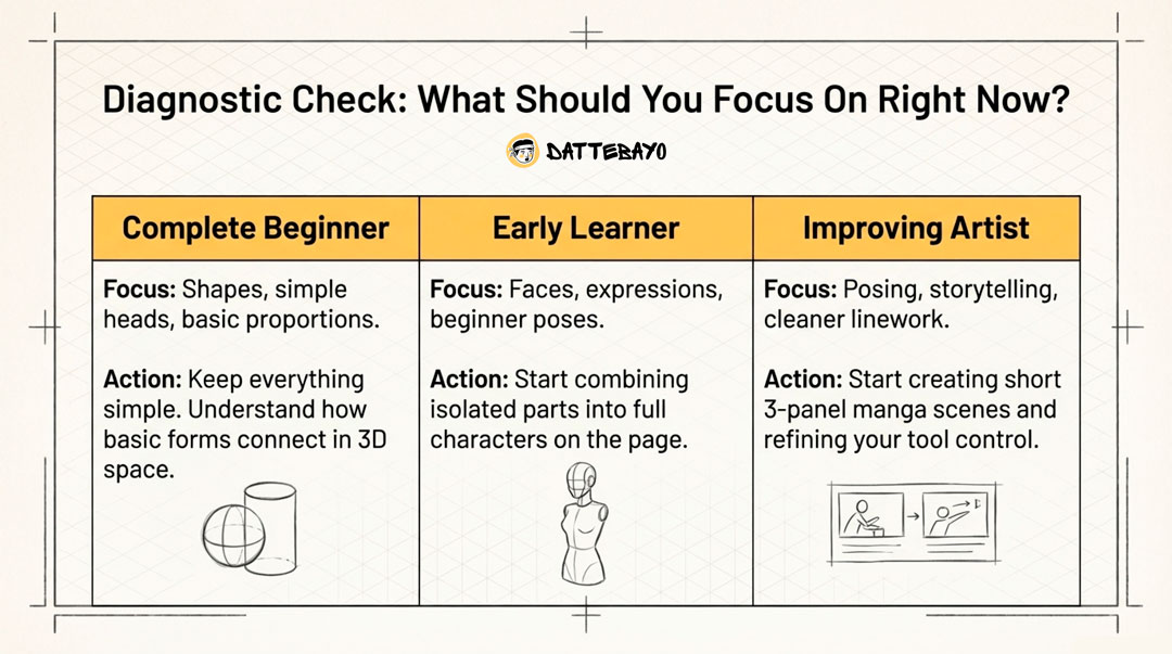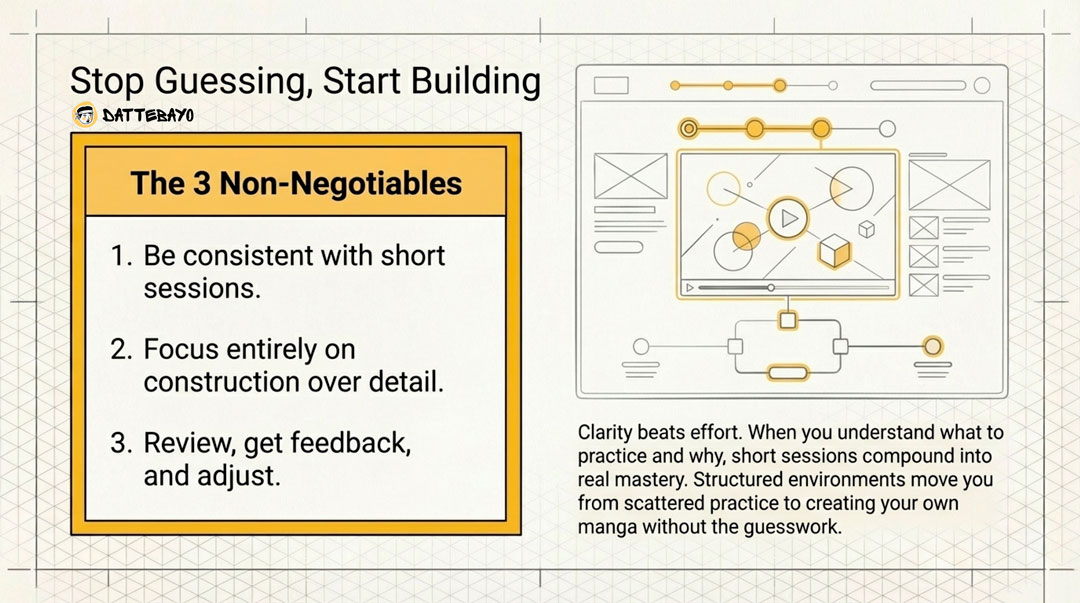 If there’s one idea to hold onto, it’s this: clarity beats effort. When you understand what you’re practicing and why, even short sessions start to compound—and drawing manga begins to feel manageable instead of overwhelming.